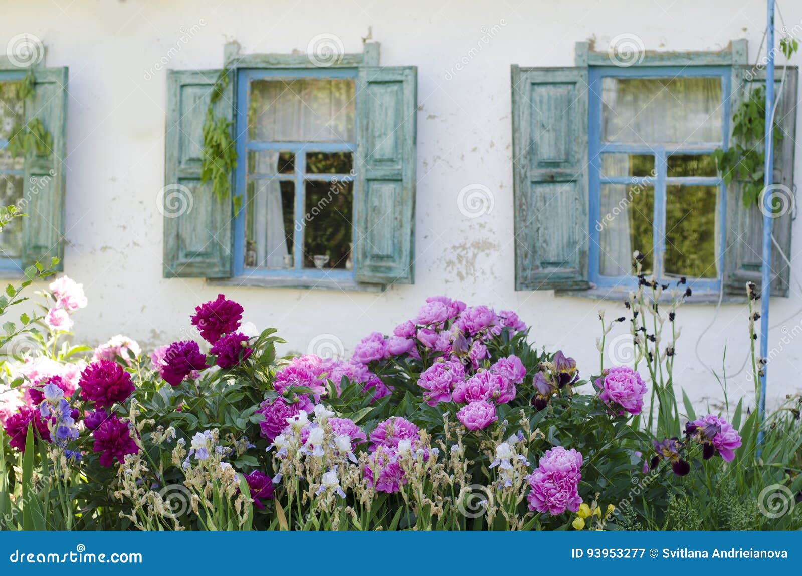 Pink Peony Bush Growing In The Garden Old Rural House In The Background Stock Image Image Of Flora Blooming 148971329